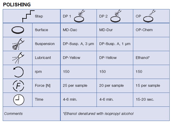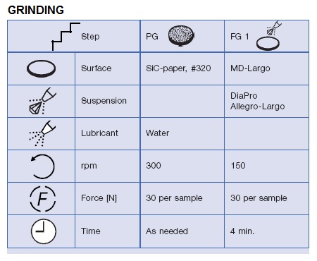 1、熱浸鍍鋅(鋅合金)薄板的工藝流程 鋼板以連續前進的方式通過熔融的鋅(鋅合金)浴槽實現表面熱浸鍍,其鋼板表面酸清洗預處理、溫度控制和鍍層厚度控制都是以自動化方式進行的。 2、各種熱浸鍍鋅(鋅合金)薄板的工藝 2.1 熱浸鍍鋅層: 含鋅量可達百分之99,厚度可控制在7~15微米;根據工藝需要,兩者可以進行調整。 應用:大量用于汽車生產,建筑構件和家庭用具,如洗衣機等。 2.2 GALVANEAL鍍層: 熱鍍鋅鋼板進行適當加熱(退火)處理,鋅元素發生擴散,生成含鐵量約百分之10的鋅-鐵表面薄膜鍍層,可以改善熱鍍鋅層的強度、耐磨性和焊接性能。 因為表面粗糙度增加,可以改善油漆涂裝性能以及鍍層耐腐蝕性。 應用:建筑物的裝飾立面,需涂裝的汽車壓延成形零件,內外儀表盤 2.3 GALVALUME鍍層 這種鋼板鍍層含有百分之55鋁,百分之43.4鋅和1.6百分之硅,具有良好的耐熱氧化性。 應用:建筑物的裝飾立面,汽車部件 2.4 GALFAN鍍層: 這是一種含有5百分之鋁及痕量稀土元素的熱浸鍍鋅層,這種鍍層具有細致的共晶組織,適用于深度拉拔,彎折,焊接,涂裝后耐腐蝕性很好。 應用:建筑業,汽車制造業以及家用電氣業。 2.5 電鍍鋅: 通過電鍍方法在薄鋼板上鍍鋅,可以得到很薄的均勻鍍鋅層,厚度在2~6微米,特別適合后續的油漆涂裝,在汽車行業應用廣泛。   3鍍鋅鋼板的防腐蝕機理: 鍍鋅在工業上廣泛應用于在大氣腐蝕環境中鑄鐵、碳鋼和合金鋼制件表面防護,其基本耐腐蝕機理是金屬鋅因其化學電位低,暴露在大氣和水里的鍍鋅制件表面還會形成碳酸鋅薄膜提供附加耐腐蝕作用。 為了增加防腐蝕作用,改善裝飾效果,鍍鋅制件還可以進行進一步的涂裝,使用材料通常是油漆及一些有機薄膜。   4、鍍鋅鋼板的金相檢測: 鍍鋅鋼板質量控制除依靠在線物理性能檢測以外,金相檢測非常重要,可以獲得別的檢測方法不能得到的質量數據信息。金相顯微組織分析可以為產品的成形、焊接和精飾,為新產品的研發工作和失效分析提供不可或缺的信息。 如果鍍鋅層過厚,會產生焊接工藝問題;如果鍍鋅層出現擦痕或裂紋,隨后的油漆涂裝以及耐腐蝕性要受損。因此,金相檢測在改善產品和提高鍍鋅工藝水平方面具有十分重要的作用。 金相檢測的項目包括鍍鋅層硬度、基體和鍍鋅層的顯微組織分析、結合力測定和失效分析。   5、鍍鋅鋼板金相檢測的特點: 因為鍍鋅層的制備工藝方法不同,鍍鋅層的硬度和厚度變化很大,對金相試樣的制備要求是不同的。制備過程中,鋅與水的反應帶來額外的困難。   5.1 鑲嵌收縮縫: 冷卻后在鍍鋅層與鑲嵌樹脂之間形成收縮縫,造成樣品清洗困難,在制作沖壓鍍鋅鋼板鑲嵌樣品特別容易發生。原因是金相檢測用于在線生產控制,因此要保證足夠的樣品數量。為保證鑲嵌質量,鑲嵌時間長為佳,但在線檢測要求即時檢測結果,鑲嵌時間不能太長,因此操作不當易生成收縮縫,導致水漬、酒精污漬、邊緣倒角、磨粒嵌入等制備缺陷,影響鍍鋅層厚度檢測和組織分析的效果。 5.2 磨拋劃痕 鍍鋅層硬度相對較低,以及易與水反應,可以在鍍層中產生劃痕,變色甚至受浸蝕。鍍層中鋅純度越高,鍍層越軟,對水反應越敏感。因此,熱鍍鋅和電鍍鋅通常硬度低,易于發生塑性變形,不能用水清洗,一般用酒精或異丙醇清洗。在添加鋁元素以及相應熱處理后,GALFAN鍍層, GALVALUME鍍層和GALVANEAL鍍層的硬度大于熱浸鍍鋅層和電鍍鋅層,相對問題較少,與水反應不太嚴重。   6、鍍鋅層的金相制備 6.1 切割:可以用常規的氧化鋁切割盤, 很薄的鋼板可以裁紙刀切割。 6.2 鑲嵌:收縮縫問題可以通過用丙酮除油和選擇合適的鑲嵌樹脂解決,用延長老化時間和環氧樹脂冷鑲嵌可以基本避免。含碳纖維酚醛樹脂熱壓鑲嵌(POLYFAST)可作為優選方法,從而避免收縮縫并保持樣品表面平整。鑲嵌時,少量樣品可以用塑料夾子定位;在線控制檢測要求快速完成,數量較多鍍鋅層樣品可以用鋼夾子固定起來,但是會留下一些縫隙,清洗有一定的困難,使得厚度檢測和組織檢測因酒精滲出受到影響。使用快速膠粘合多個樣品后熱鑲嵌(POLYFAST)可以排除縫隙,得到合格的樣品。 6.3 磨和拋光:常規的鍍鋅鋼板用不同粒度SiC砂紙,再經2~3道金剛砂拋光。推薦用特殊的細磨盤(MDLargo)代替SiC砂紙,使用金剛砂噴霧劑或懸浮劑,縮短操作時間。MD-Largo方法可以保持樣品邊緣不倒角,這對于高倍觀察特別重要。隨后的拋光過程,用3微米和1微米的金剛砂拋光劑就足夠了??偟哪伈襟E可從6步減少到4步。不同的工藝生產的鍍鋅層硬度不同,但自動磨拋制備方法均適用。如果不用自動加料的磨拋系統,金剛砂噴霧劑因為不含水,也可以獲得好的效果。自動加料磨拋系統需要使用無水金剛砂懸浮劑和潤滑劑避免污染鍍鋅層。綢布可以保持樣品平整,有時也會產生劃痕。起毛絨布會產生表面浮突,要避免使用。自動加料磨拋系統(如RotoSystem)具有可靠的,重復性好的優點。   7鍍鋅層金相制備方法 7.1 研磨 7.2 拋光 8、樣品清洗 ●? 鋅與水的反應使樣品清洗困難。在磨制過程可以不考慮,但是在金剛砂拋光時清洗劑推薦用添加異丙醇的酒精,用清潔的壓縮空氣干燥。 ●? 清洗用添加異丙醇的酒精在MDChem拋光布短暫輕拋,再漂洗和干燥,效果很好。如果使用自動加料磨拋系統,可用大劑量的無水潤滑劑,拋光數秒鐘,可以使隨后清洗方便。   9、浸蝕和實例 常用